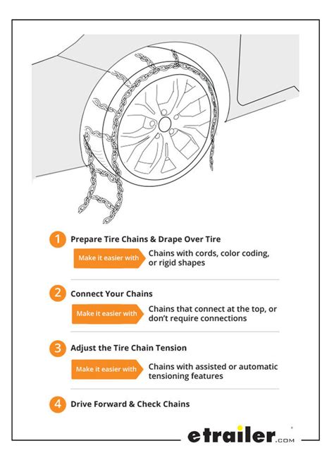 Adjust the tire chains to fit snugly around the tire. Make sure the chains are not twisted or tangled, and that they are evenly distributed around the tire. If your tire chains have a tensioning system, use it to tighten the chains.